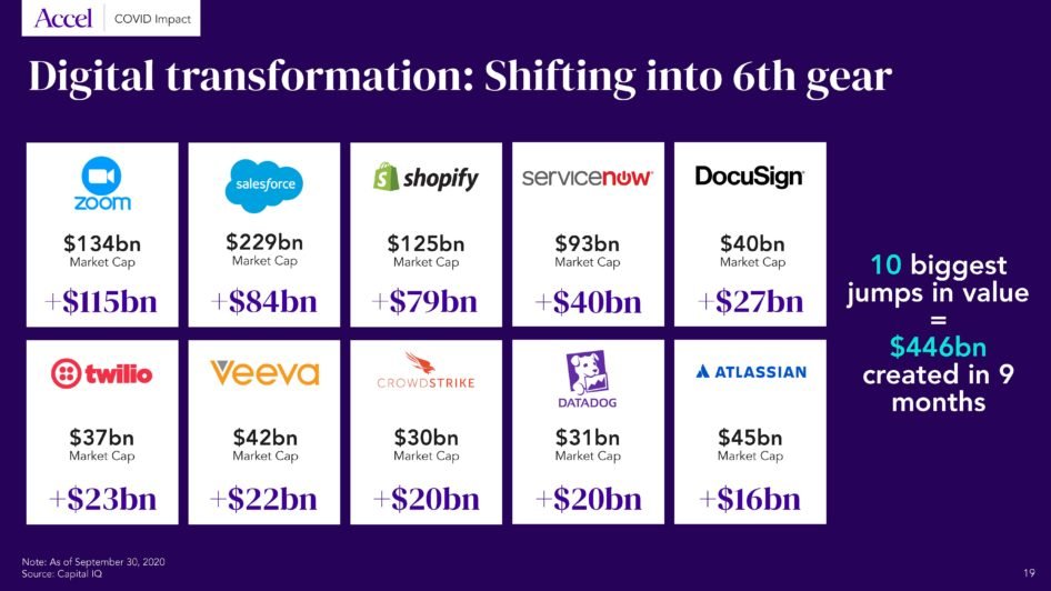 The first impact of COVID has been to radically transform the work from home paradigm and massively accelerate digital transformation – by at least two years. Ten public cloud companies have hugely benefited from this acceleration, Zoom being the first. Together, these ten companies have seen an increase of their market value by close to $0.5 trillion, representing half of the increase in value of the global cloud Index in just nine months.