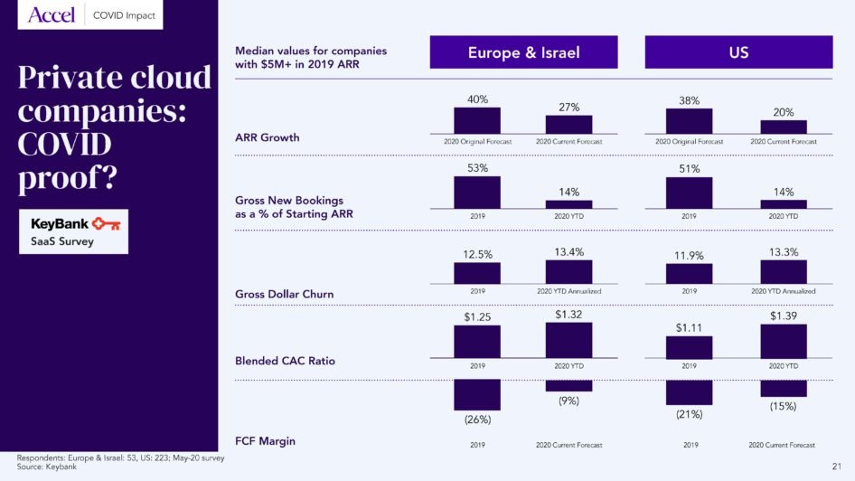If we look at the survey performed by KeyBank, it’s very much in line with what we have observed in our portfolio. Overall, COVID-19 prompted people to revise their growth forecast slightly downward and be more conservative on their cash burn, but so far, the impact hasn’t been dramatic. Interestingly, companies have adapted very similarly in Europe and the US, except on the cash front, where EU companies have been more conservative.