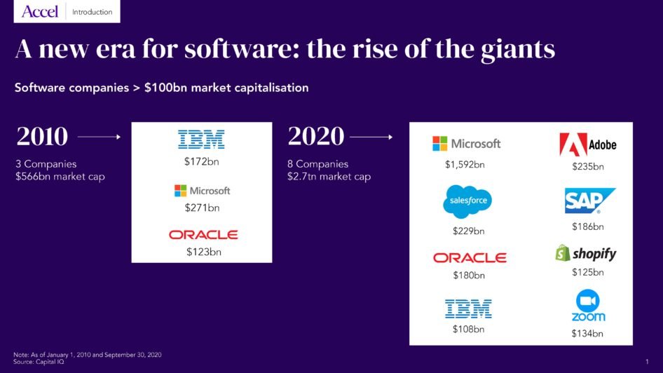 Software has been eating the world for 30 years now, but looking at the acceleration we have seen in the past decade, software has entered a new era: “the rise of the giants”. There are now eight software companies north of a $100 billion market cap, representing $2.7 trillion of market value. This is a big jump vs. 2010 when we only had three companies (Microsoft, Oracle and IBM) valued just over $550 billion. What’s even more impressive is the new generation, with 75 public cloud companies valued above $1 billion vs eight companies in 2010 and 26 of these companies are already above $10 billion.