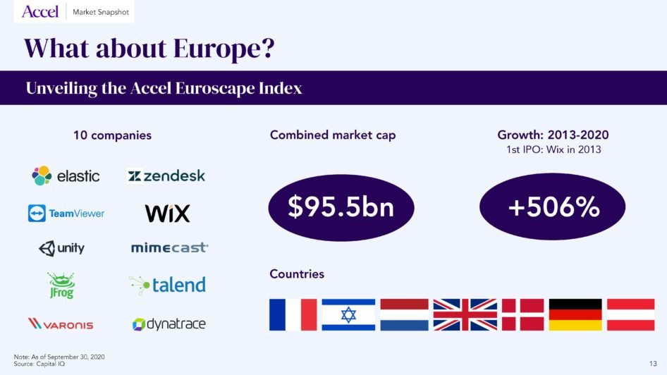 When I started in venture, I was fortunate to witness the birth of the first generation of cloud companies in the US. This led me to launch the SaaS 13 Index in February 2008 while I was at Bessemer. It consisted of 13 companies and in 12 years has evolved into a massive Index representing $1.7 trillion in market cap. Today, we’ve reached the point where Europe deserves its own Index, and we’re very happy to announce the creation of the Accel Euroscape Public Index, the Index of public cloud companies born in Europe and Israel.