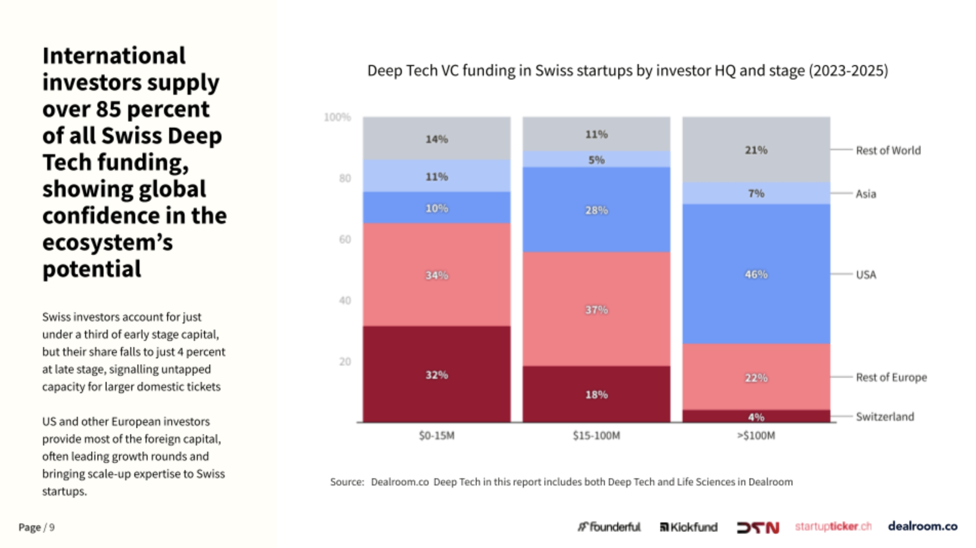 - Nearly 96 per cent of late-stage Deep Tech rounds in Switzerland were led by global investors, with US and EU firms now accounting for the majority of capital inflow.
