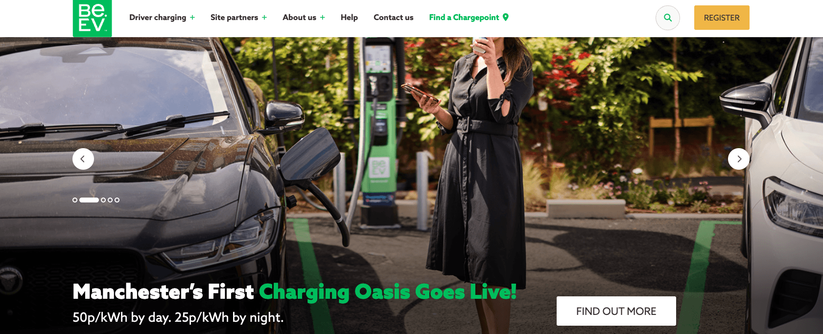 Be.EV is a UK electric-vehicle charging network delivering rapid, reliable and accessible charging nationwide. Founded in Greater Manchester in 2019, it now operates 800+ charging bays and powers them with traceable green energy from wind and solar.