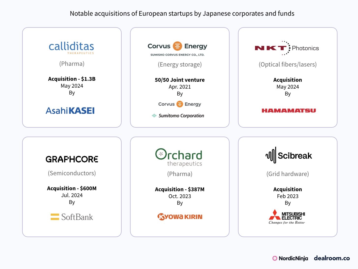 Corporates are not only investing in European tech, they’re increasingly active acquirers and partners. 2023 marked a record year, with 15 European VC-backed startups acquired by Japanese firms, from Asahi Kasei’s $1.3 billion purchase of Calliditas in pharma to Mitsubishi’s acquisition of Scibreak in grid hardware.