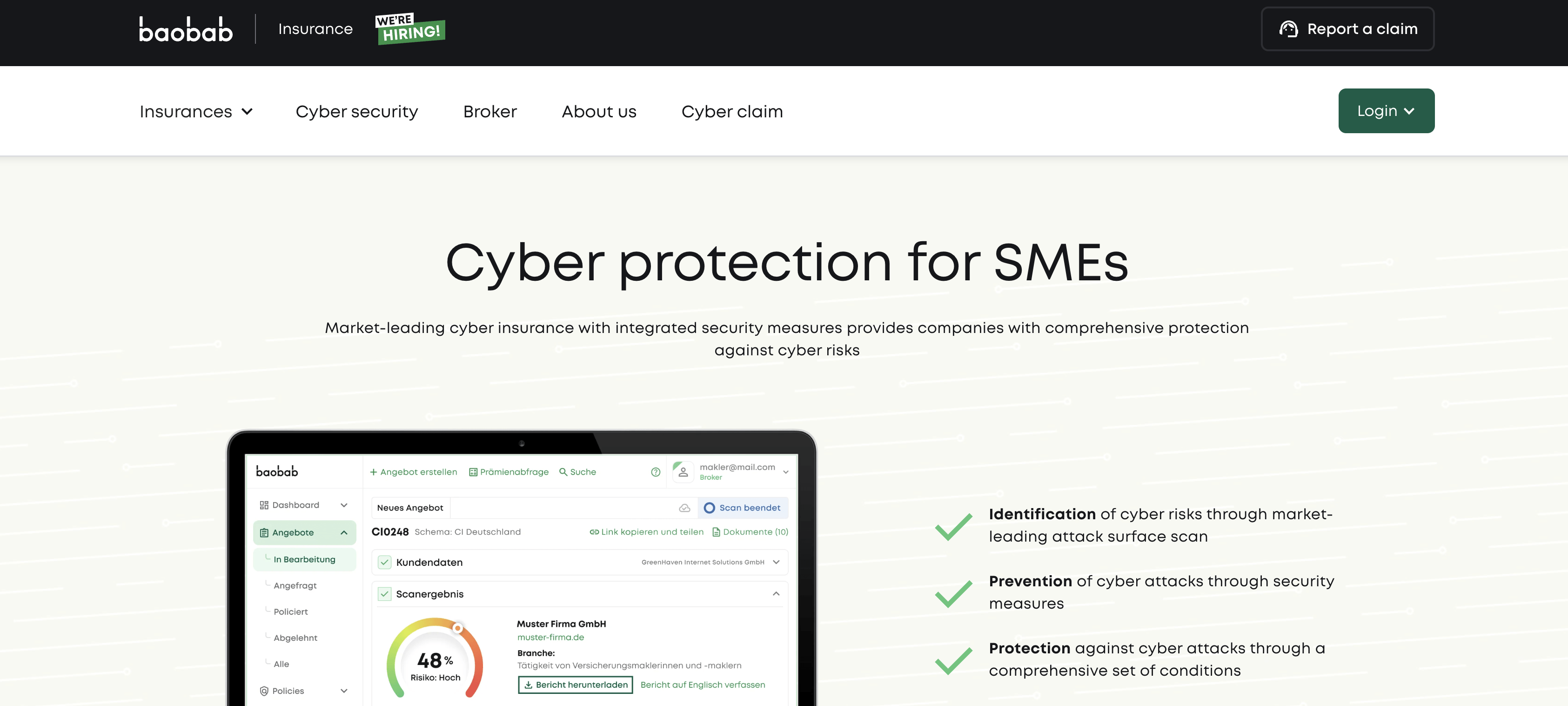 Baobab is a Berlin-based cyber-insurance MGA that combines a market-leading insurance policy with built-in risk-prevention services for Europe’s SMEs, delivered through a broker-friendly digital platform.