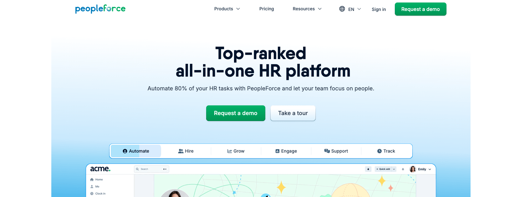 PeopleForce is a cloud-based HR software platform that helps companies manage the entire employee lifecycle, including recruitment, onboarding, performance, and engagement, through a single, integrated system.