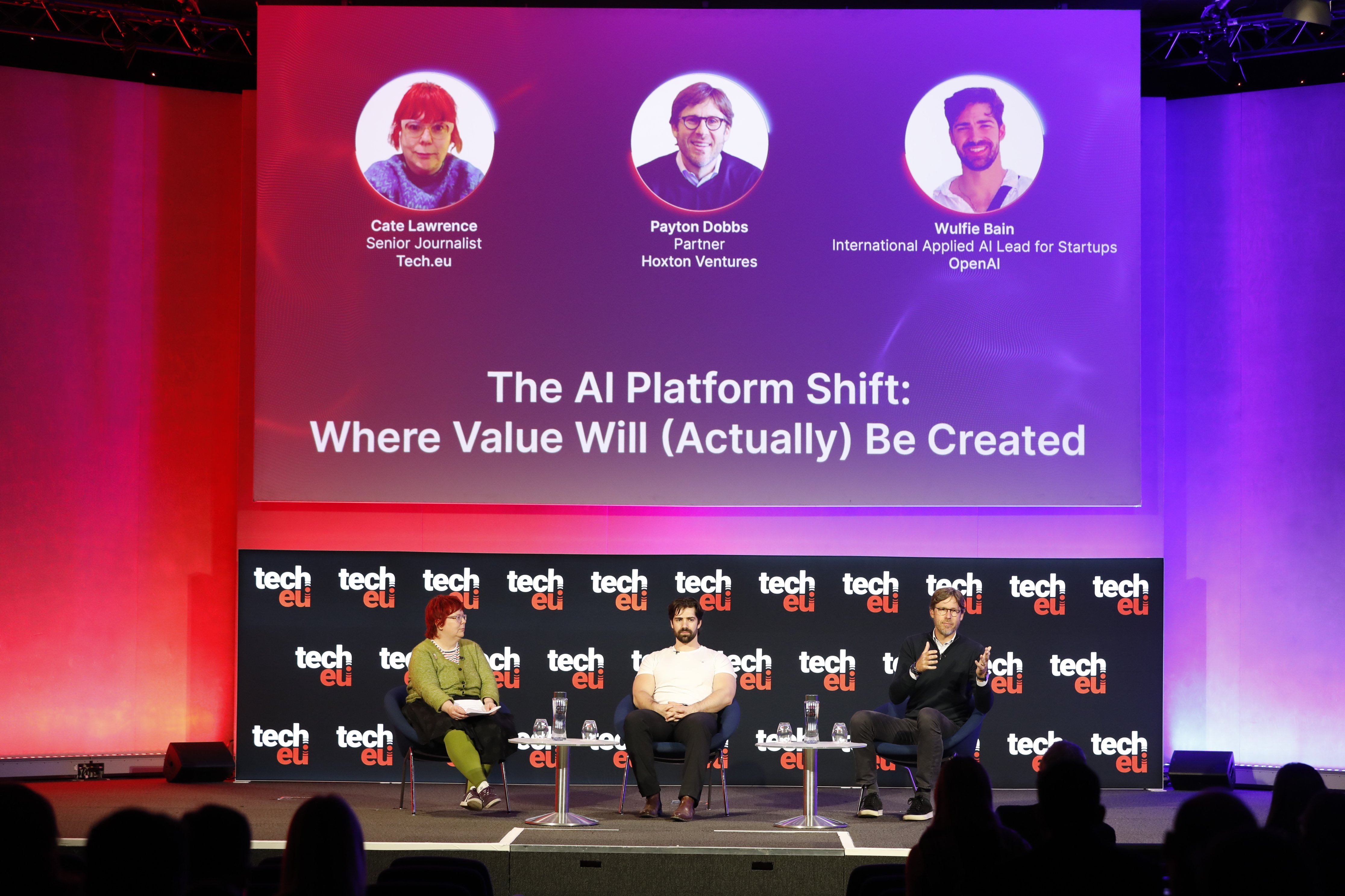 Cate Lawrence (Tech.eu), Payton Dobbs (Hoxton Ventures), and Wulfie Bain (OpenAI) discussed where value is actually accruing in the AI stack, focusing on how the balance is shifting from foundation models toward application layers and distribution.
