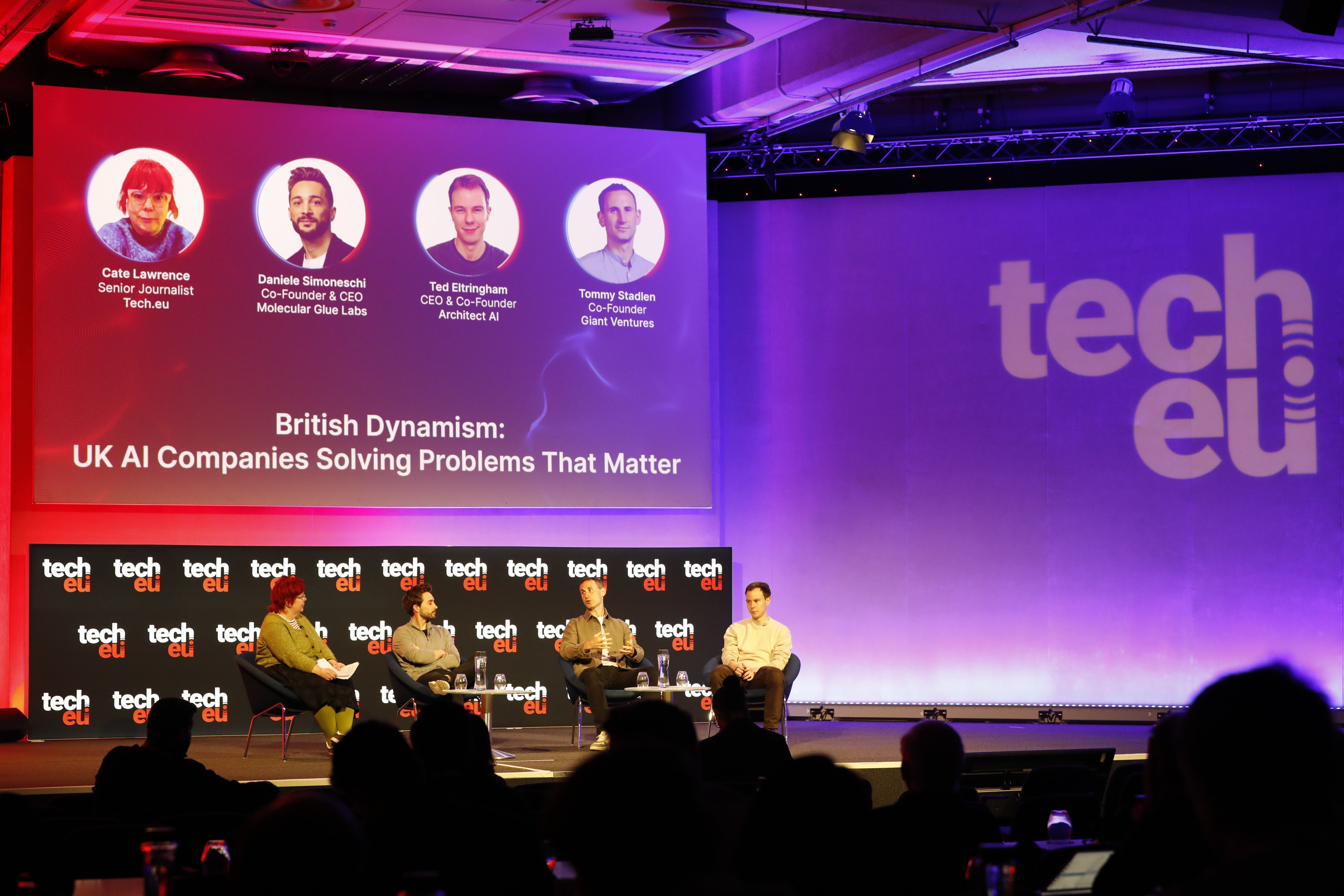 Cate Lawrence (Tech.eu), Daniele Simoneschi (Molecular Glue Labs), Ted Eltringham (Architect AI) and Tommy Stadlen (Giant Ventures) highlighted how a new generation of UK-based AI startups is focusing on solving concrete, high-impact problems across industries.